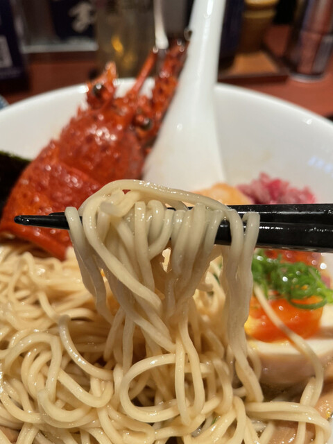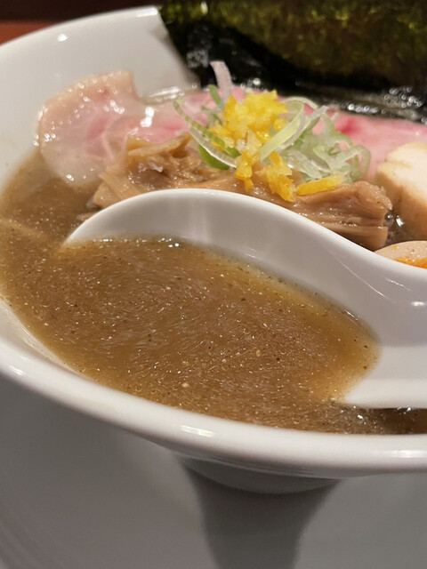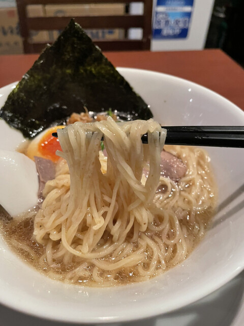 見た目からスープの濃度が違いますね。ややとろみのあった「濃厚」と比べてサラリとしています。煮干し粉もしっかり入っているようで、鱗がキラキラ。一口目からガツンとビターな煮干しの旨味とその奥に感じる酸味。時折感じる柚子の風味が爽やかではありますが、「濃厚」よりも圧倒的にパワフルになってますね。