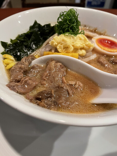 津軽煮干し中華蕎麦(味玉入り)¥900、本日限定宮崎牛肉丼¥500