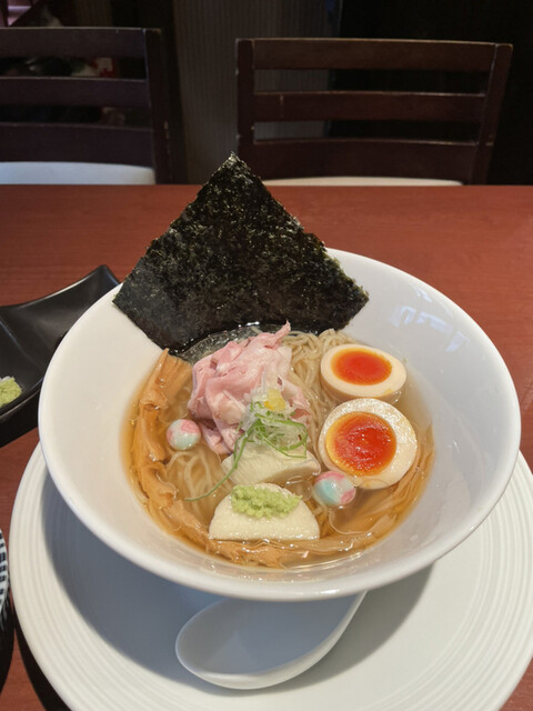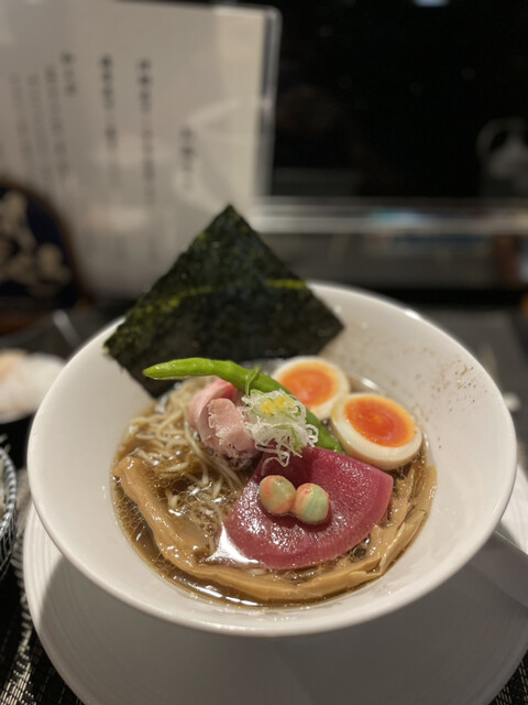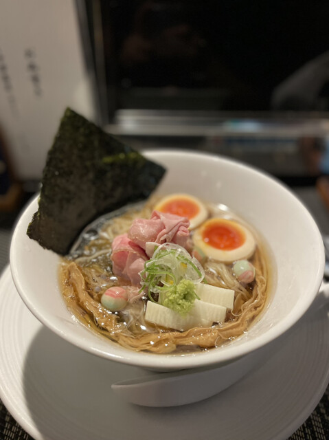 今日は基本の「津軽煮干し中華蕎麦(味玉入り)」¥900とTwitterにて告知の「海老オイルの和え玉」¥400