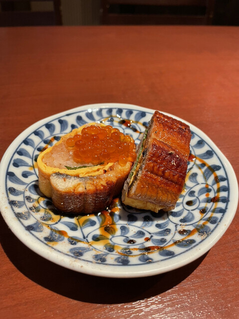 うなぎの棒寿司は、「照り」の美しさにちょっとびっくり。ここは老舗の鰻屋さん? しかし、鰻はデカいのを使ってますね。とて肉厚で身はふわふわです。ほんのり甘めのタレが鰻の風味を後押ししていて、さらにちょこんと乗ったイクラの塩味がほどよく味を締めてくれています、、、って、これが¥350ってありえんだろ!いや、美味かった〜