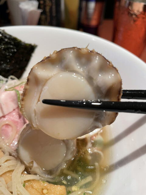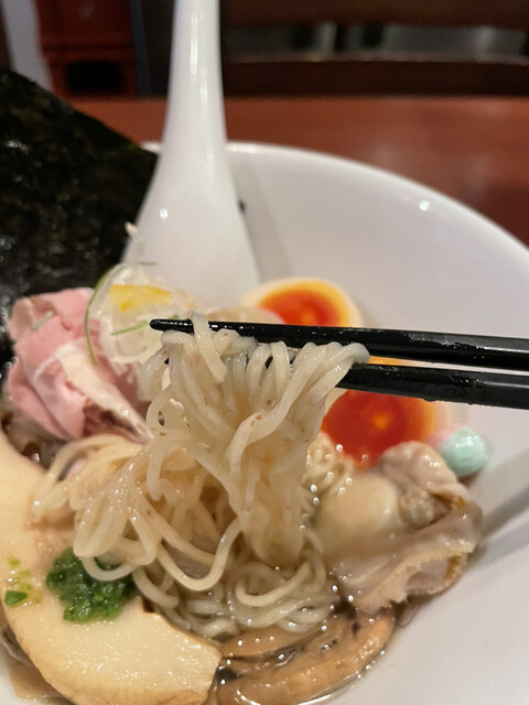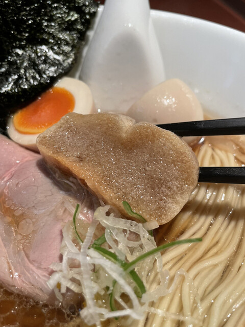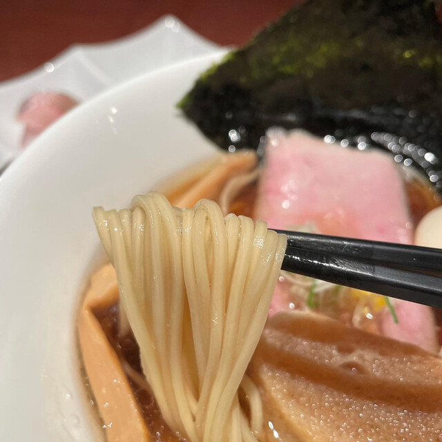 スープは淡い琥珀色。今回のスープはカエシにも干し貝柱を漬け込むことで風味をアップし、さらに白醤油をブレンドしているとのこと。確かに、帆立の深い旨味を湛えつつ白醤油の塩味を効かせたキリッとした醤油味に仕上がっています。