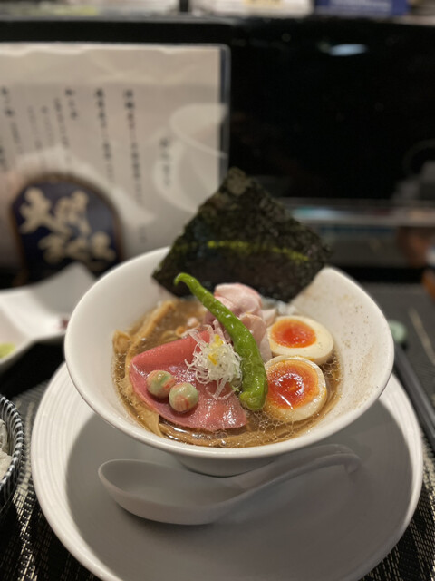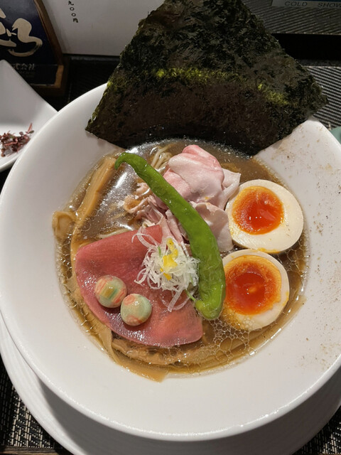 チャーシューの代わりに、A5ランクの宮崎牛のスライスを使ったり、アイスプラントやフライドオニオン、竹炭麩といった変わり種トッピング。
