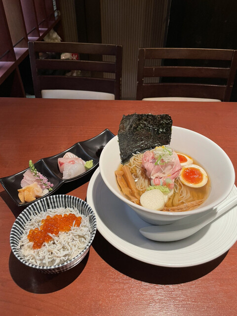 気を取り直して、注文はレギュラーメニューの「津軽煮干し中華蕎麦(味玉入り)」¥900と海鮮丼¥500