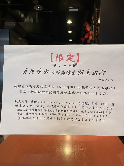【限定】冷やしらぁ麺(真昆布水×陸奥湾産帆立出汁)¥1300