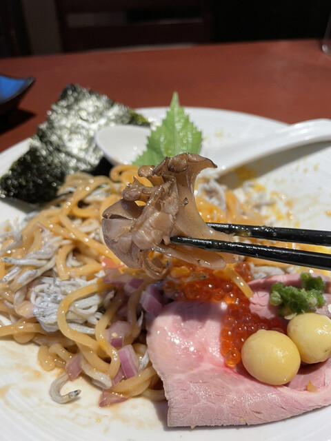 トッピングには、秋の味覚、銀杏や舞茸、大葉や柚子、青唐辛子が風味、食感に変化を与えていて、美味しくも楽しいまぜそばに仕上がっています。