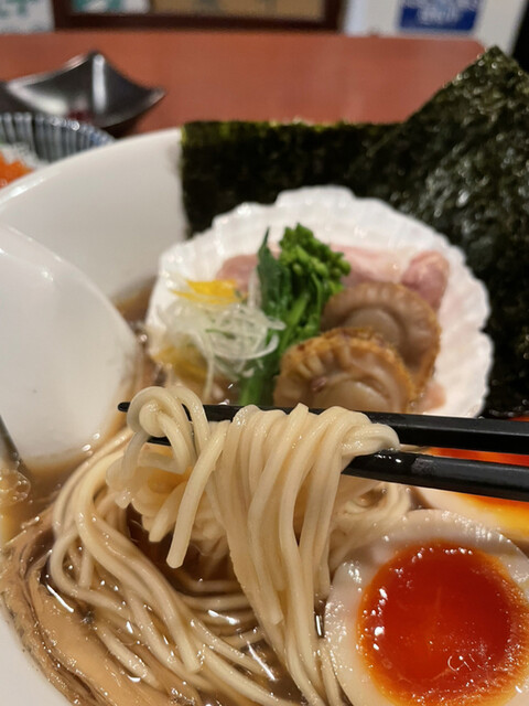 琥珀色の清湯スープは見た目は煮干し中華ですが、お出汁は煮干しを一切使わず大量の帆立のみでとった豪華な一品。煮干しとは異なり繊細ながら風味豊かなスープに仕上がっています。