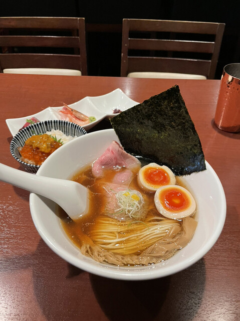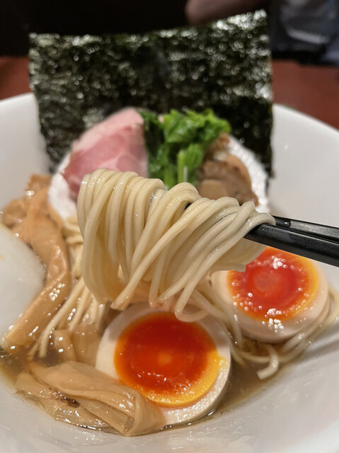 煮干しの旨味とほどよい苦味、まろやかな醤油のコクを感じられる絶品スープに、ちょい堅めの中細麺がよく合う逸品。低温調理のチャーシューもしっとり柔らかく美味。こだわりの味玉の味付けも良い塩梅。穂先メンマの味付けも控えめで上品。何度食べても変わらぬハイクオリティな一杯でした。