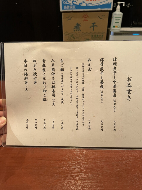 期待していた限定メニューの提供は明日からとのことなので、本日はレギュラーメニューの「津軽煮干し中華蕎麦(味玉入り)」¥850を、いつもの海鮮丼とさばの棒寿司と共に。