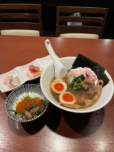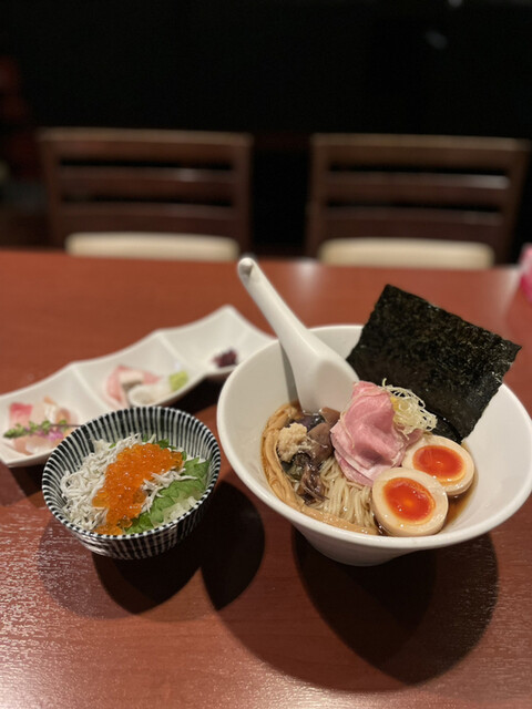 今日はレギュラーメニューの「津軽煮干し中華蕎麦(味玉入り)¥850と海鮮丼¥500