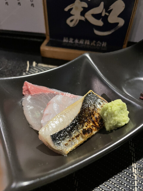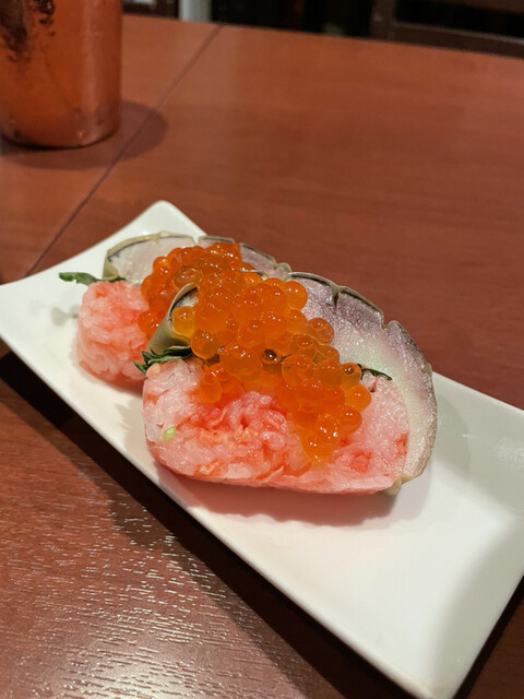 棒寿司には、サービスでイクラをトッピングしてくれました。こちらも脂の乗った鯖と大葉や紅生姜の風味が口の中を楽しくしてくれる逸品です。