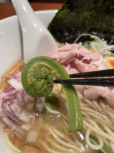 天然の桜鯛と鶏のダブルスープは風味も良く旨味たっぷり。ラーメンには珍しいこごみの食感と風味もこのスープによく合っています。