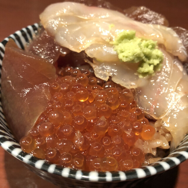 脇を固める「海鮮丼」¥500も小さいサイズながらマグロと白身の漬けとイクラが乗った贅沢な丼。酢飯に赤酢を使っているあたり、店主のこだわりが感じられます。