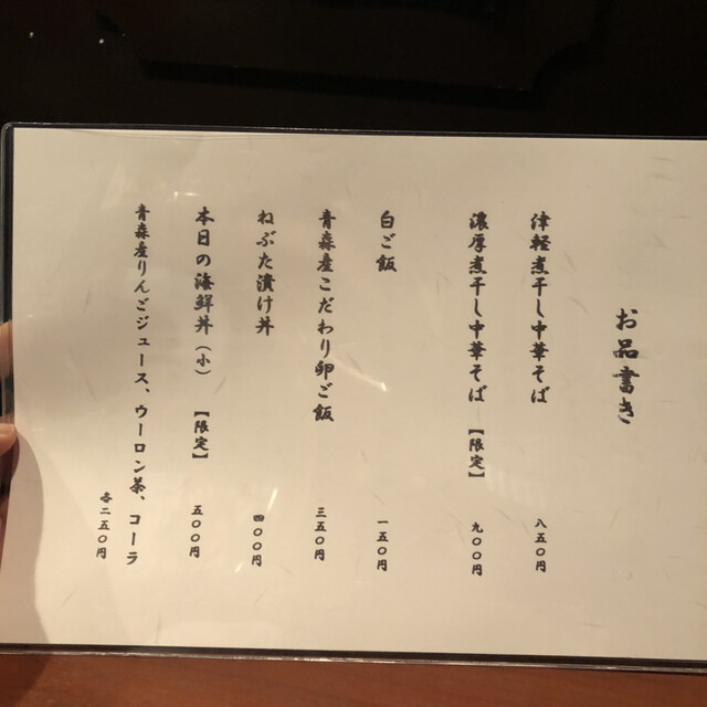 ・濃厚煮干し中華そば ¥900 の2種類。サイドメニューとして、ねぶた漬け丼¥400や海鮮丼(小)¥500などもあります。