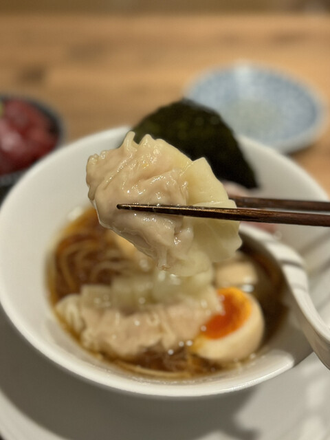 本日のゲリラ限定はまぐろの漬け丼と肉ワンタン。ねっとりしたまぐろの食感に出汁醤油の旨み。白飯お代わりしたくなる逸品❗️肉みっしりのワンタンは薄味で煮干スープとの相性抜群‼️