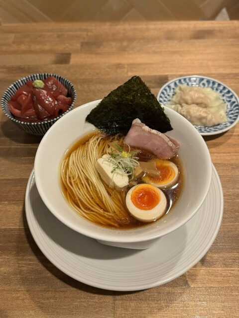 津軽煮干し中華蕎麦(味玉入り)¥950、【限定】大間まぐろ漬け丼¥500、肉ワンタン¥200