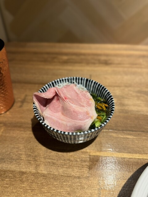 煮干しの旨みをすっきりした塩でまとめたつけ汁に、昆布水を纏ったツルモチ中太麺は抜群の味わい。山形のだしと岩海苔はシャキッとした食感と磯の風味を演出。大判のレアチャーは厚みもしっかりあって食べ応え充分‼️
