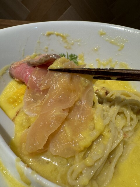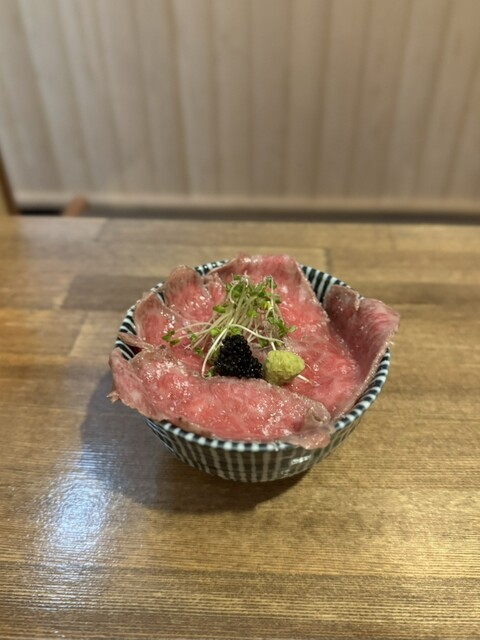 糖度の高い青森産の嶽きみをたっぷり使って濃厚に仕上げた冷やし。丼のフチの塩をまぶすと甘味が増して、もうスイーツ感覚。トッピングの鶏の生ハムの塩味が上手くバランス。豪華なトモサンカクのローストビーフも美味