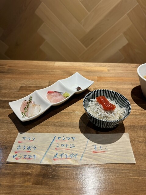 海鮮丼は、サワラ、ホウボウ、ヒラスズキ、ヒラマサ、シマアジ、メイチダイ、すじこ、釜揚げしらす。
