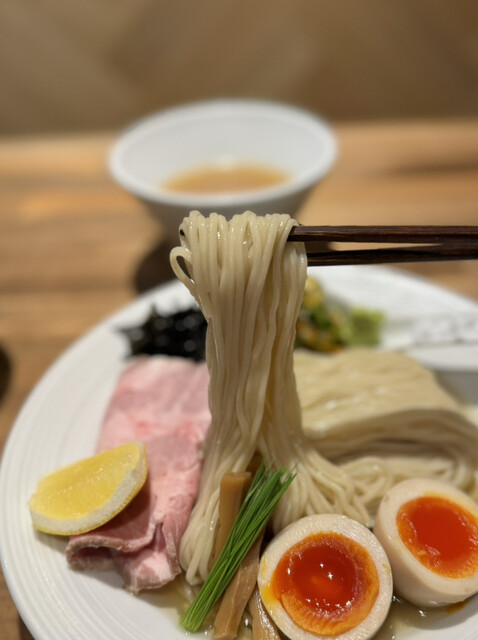 旨みしっかりの昆布水に浸かった平打ち中太ストレート麺は、ツルプリ美味。キリッと冷やされたつけ汁は煮干しの旨みとすっきりした塩のカエシで夏らしい仕上がり。
