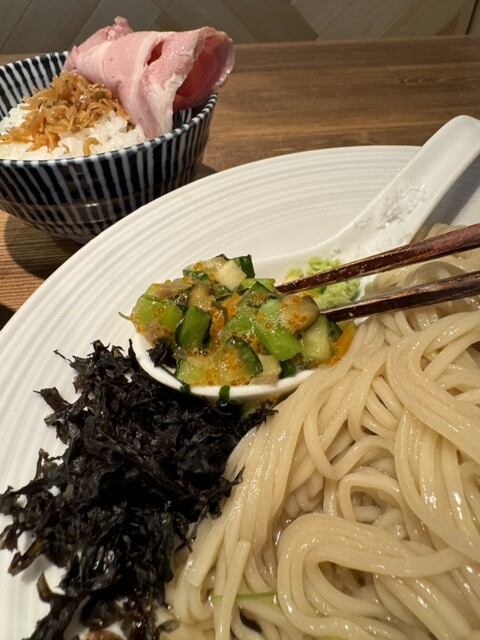 【限定】冷やし塩つけ麺(がごめ昆布水×煮干出汁)¥1400、白ご飯¥150