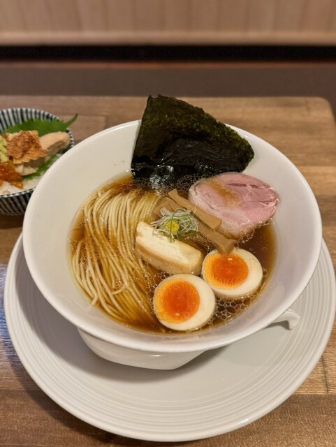 津軽煮干し中華蕎麦(味玉入り)¥950、【限定】銀聖鮭親子丼¥500