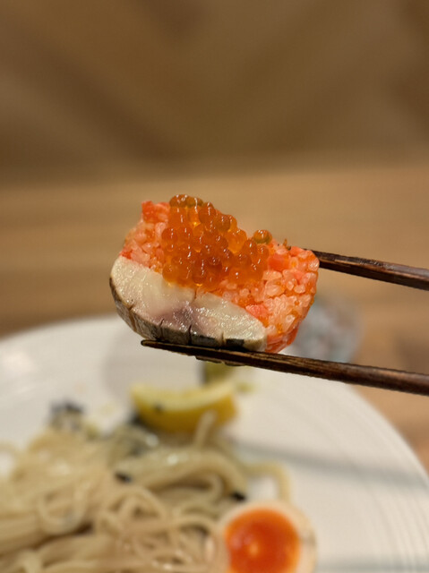 【限定】冷やし塩つけ麺(がごめ昆布水×煮干出汁)¥1400、さば棒寿司¥250