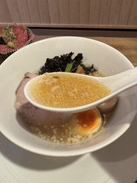 【新】山椒塩煮干し中華蕎麦(味玉入り)¥1100、A5和牛たたき丼¥500