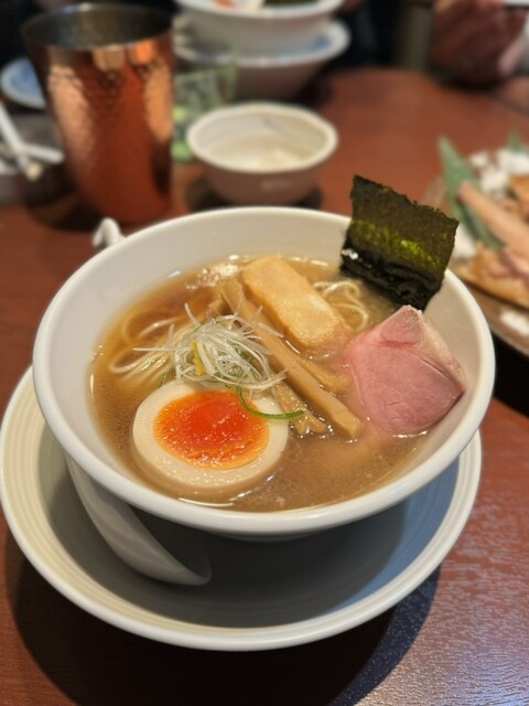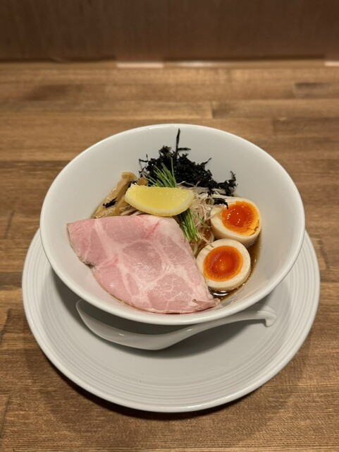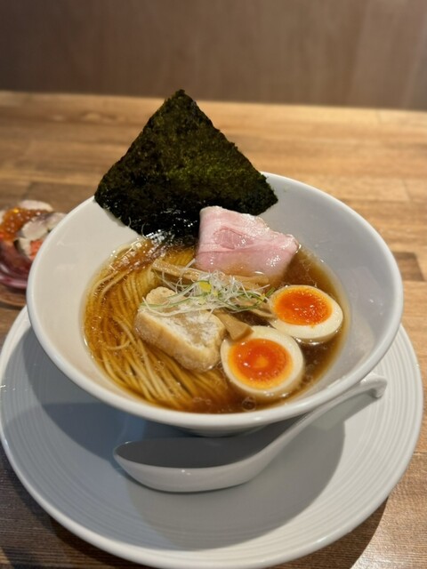 ふわっと香るぶどう山椒の爽やかな刺激と煮干しの旨み。キリッとした白醤油でスッキリ仕立て。全粒粉入りの麺の風味も良く、レアチャーも美味‼️
