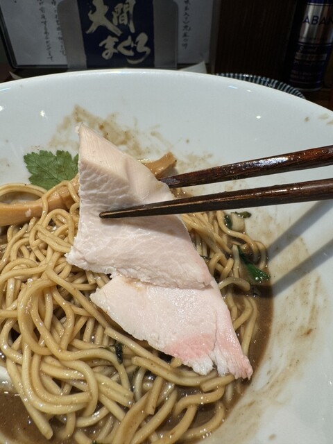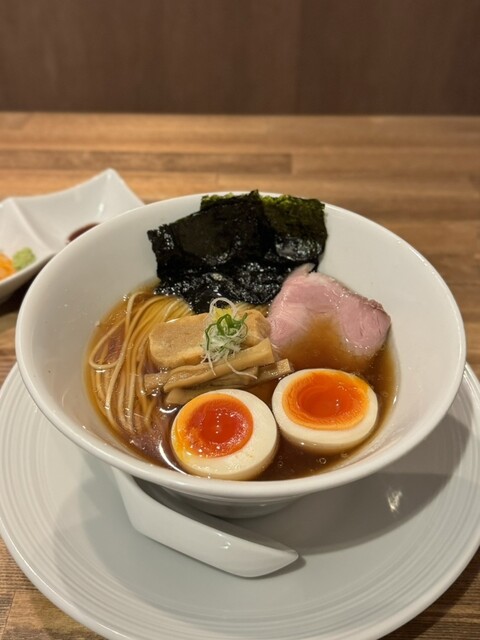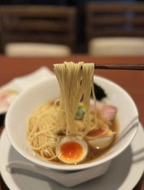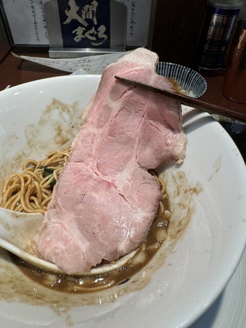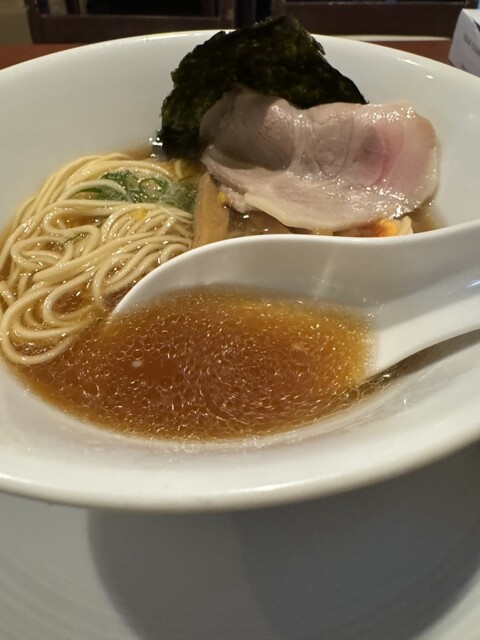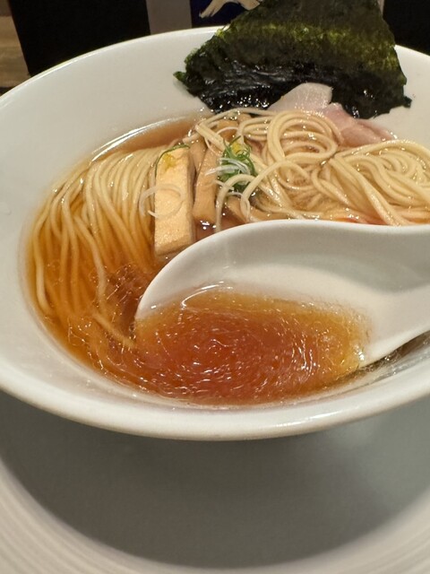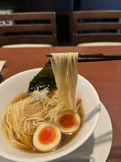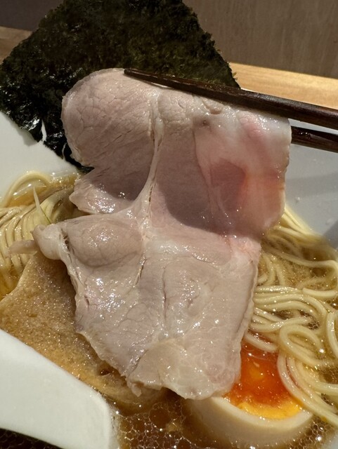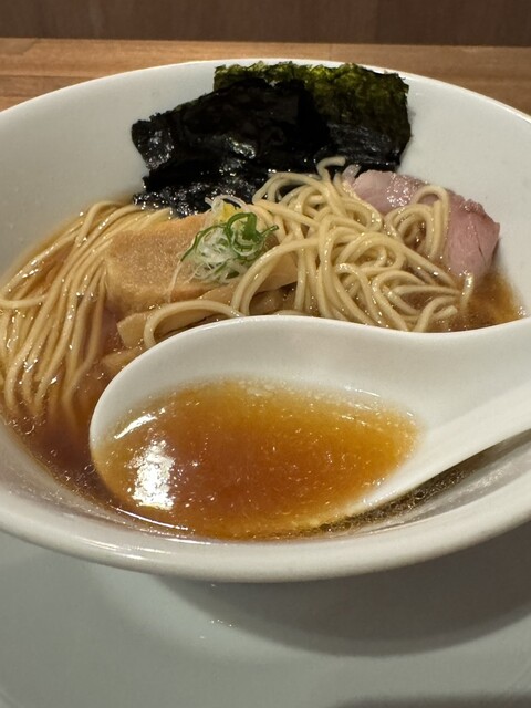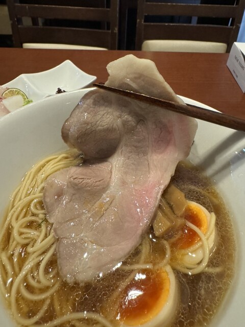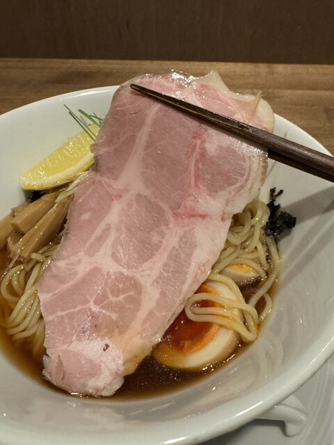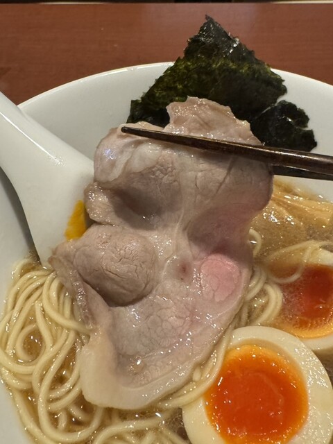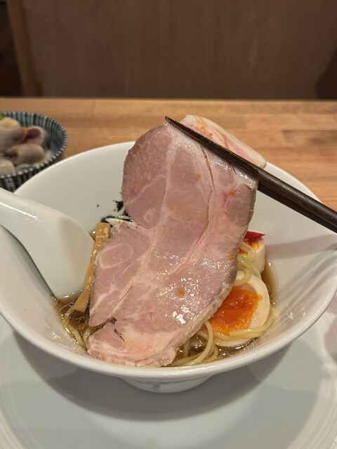 今日の煮干しは平子、白口、背黒でしっかりした旨味とほどよい苦味。津軽醤油のコクが全体を上手くまとめ上げるバランス良い仕上がり。細ストレート麺ツルパツ食感、レアチャーも相変わらず素晴らしい‼️