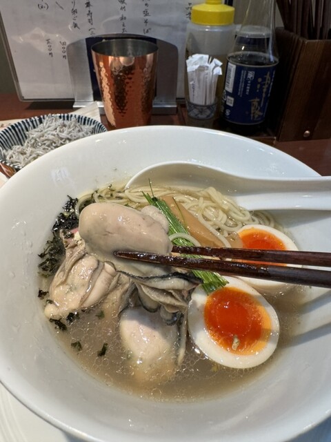 ふっくらした牡蠣がたっぷり乗った絶品塩そば。 プリップリ、大振りの牡蠣が5〜6個も