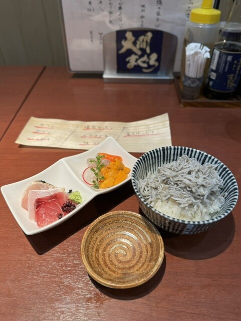 海鮮丼は、大間の中トロ、マダイ、アイナメ、サワラ、マナガツオ、アオリイカに大間の塩ウニ。ご飯には釜揚げしらす。大間のまぐろはやっぱり美味い‼️
