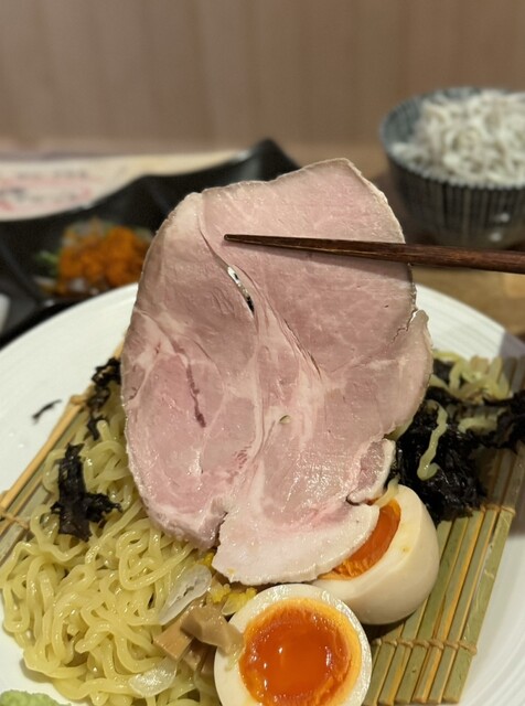 今日は雲行き怪しい感じだった為か混雑なく冷やしを頂けました❗️キリッと冷やされたスープはほんのりとろみとしっかりした煮干しの旨み、津軽醤油のコクと芳醇な香りも素晴らしい逸杯‼️