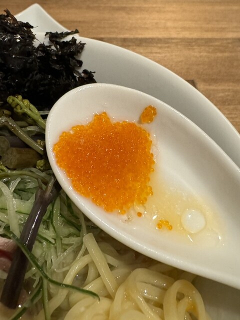 新鮮な生うには上品な甘みが特徴のムラサキウニ。鮑はコリッコリ、キャビアは控えめな塩味で素材の旨みを堪能できます。さらに、スープにはとびっこもたっぷり、これが麺に絡んでプチプチ食感に‼️