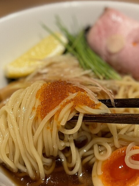 本日のゲリラ限定、屯のニボコン風冷やしは売り切れ、、、で、いつもの津軽煮干し。平子、白口、背黒を使った煮干し出汁はほどよくほろ苦。今日はカエシが心なしかすっきりした味わい。ツルパツ細ストレート麺の食感も抜群‼️