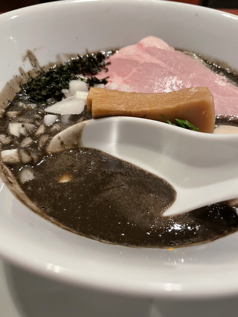 イカ墨で真っ黒に染まったスープは、煮干しの濃さも桁違い!塩味もググッと強めのマニア向けの特濃スープ。パツンと歯切れの良い低加水細ストレート麺との相性も抜群!
