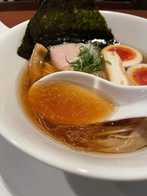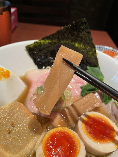 一般的に独特のくさみのある真鯛ですが、こちらでは鮮度の良い天然物のみを使っているとのことで、全くくさみはなく、その上、旨みと深みがケタ違い。まろやかなカエシと相まって上質な「和」のお出汁のようなスープに仕上がっています。