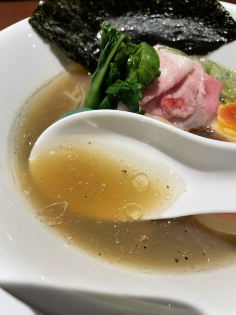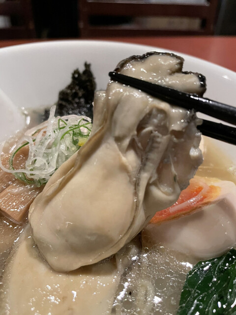 トッピングされた牡蠣の大きさにも圧倒されます。しっかりした牡蠣の旨み溢れるお出汁は、すっきり優しい塩味で正に滋味深い味わい。