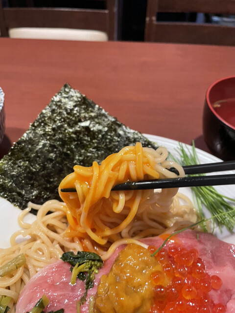 加水率高めの中太麺はもっちり食感。卵黄やイクラと絡むとコレまた美味。