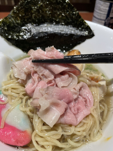 低温調理のカタロースチャーシューは貝出汁スープに合わせて極薄スライスに