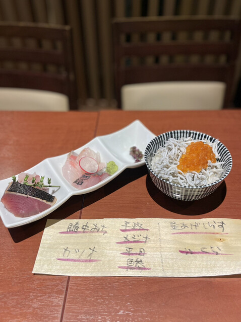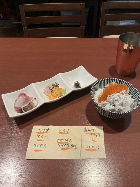 海鮮丼¥500は、カツオ、スズキ、カマス、ヒラメ、アオリイカとび子添え、釜あげしらす、いくら