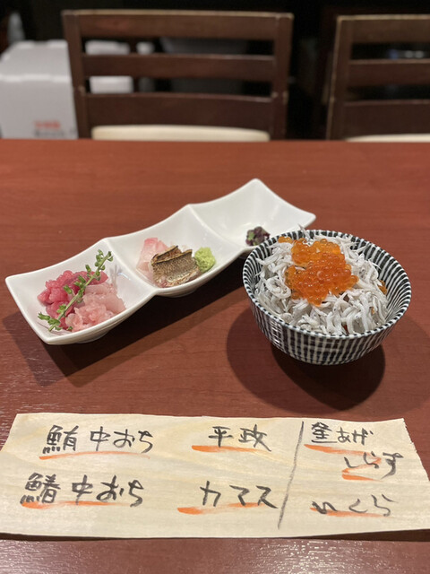 海鮮丼¥500は、まぐろの中落ち、さわらの中落ち、ヒラマサ、カマス、釜揚げしらす、いくら