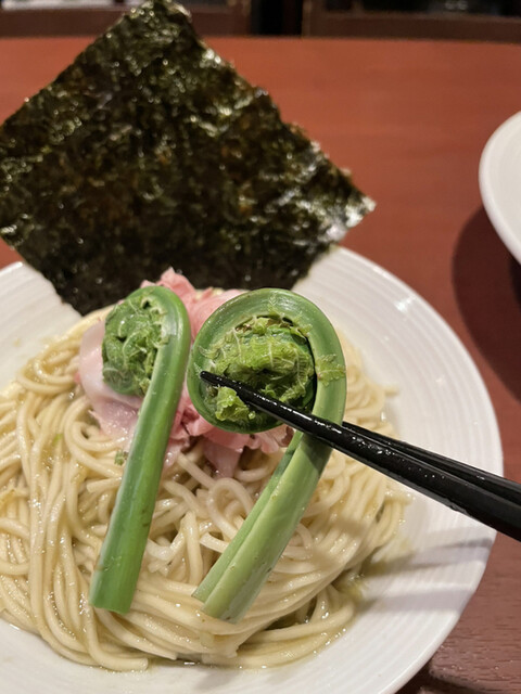 青森から山菜が届いたとのことで、本日は和え玉が山菜スペシャル。トッピングのこごみは、シャッキリ歯応えにさわやかな苦み。タレにも山ウドやタラの芽を使って春らしい和え玉に。