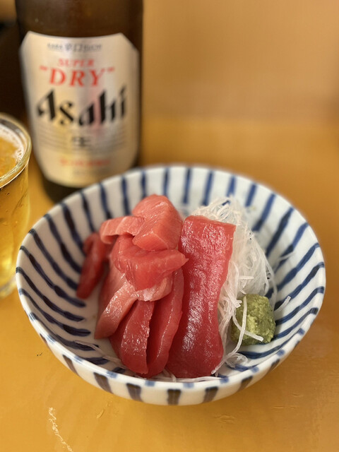 この日は、ご主人のご厚意で、キンキンに冷えたビールと共に、マグロの刺身、アジフライ、ホタテ貝柱フライを頂きました。