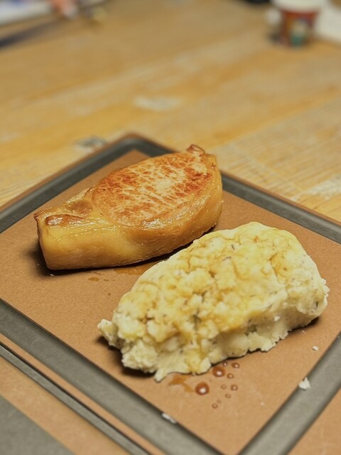 厚切りの豚ロースとバラ肉を使ったトンテキとポテトサラダ。こちらも絶妙な火入れでほんのりピンクの断面。メチャウマですね。