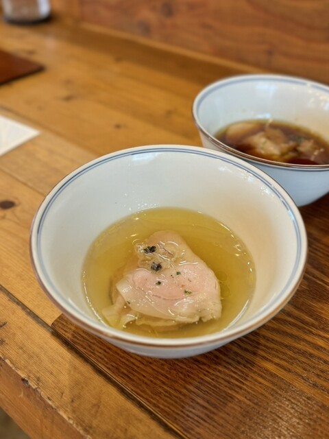 金色に輝くスープはたちのぼる湯気さえ神々しく見えます。すっきりながら深い旨味のスープにしなやかな細ストレート麺、トッピングの炙り鶏チャーには鹿児島県産の黒王❗️歯応えしっかりで旨味も濃厚です。厚切りの豚ロースもしっとりしていて肉々しく美味❗️食べ進めるにつれコクと旨味が増してくるスープにはホント毎回ヤられます。しみじみ美味い