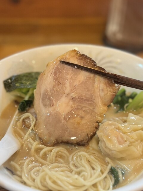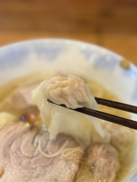 塩らぁ麺よりほんの少し太いストレート麺はしなやかながらコシもしっかり。吊るし焼き焼豚は香ばしく上質な肉質。肉雲呑、海老雲呑も絶品‼️