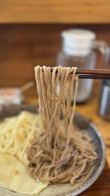 田舎そばっぽい麺はざらっとした舌触りが特徴的、対する白い平打ち麺はつるプリ、本山葵の乗った一反もめんはもちピロと三種類の食感を楽しめるつけ麺。