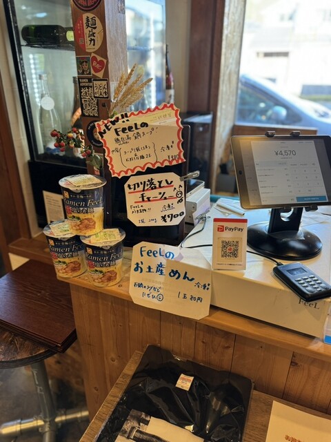 会計の際、レジのところに行ったら、今日は「おみやげ麺」があるようなので、つけ麺用の白と黒を買って帰ります。FeeLの絶品自家製麺を家に持ち帰っていろんなスープでいただくのも楽しみなんですよね❗️今日はラッキー‼️