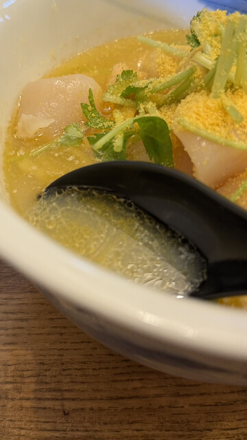 磯の風味豊かなスープはほたるイカや和出汁を鶏の旨みが下支え(←店主の受け売りw)。キリッとシャープな塩味は食べ進めるうちに円やかに変化する多層的な演出。するりとしなやかな細ストレート麺の食感、トッピングの雲丹と蕪もこれまた美味❗️