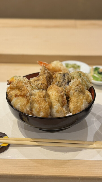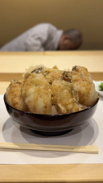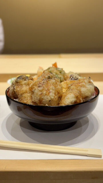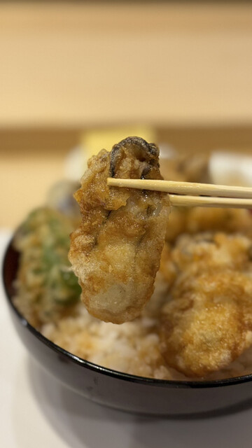 薄衣の牡蠣の天ぷらは、絶妙な火入れで水分を保ったまま旨みを閉じ込め、ほどよい甘みの丼タレが旨味を引き立てる仕上がり。味も食感も最高です‼️